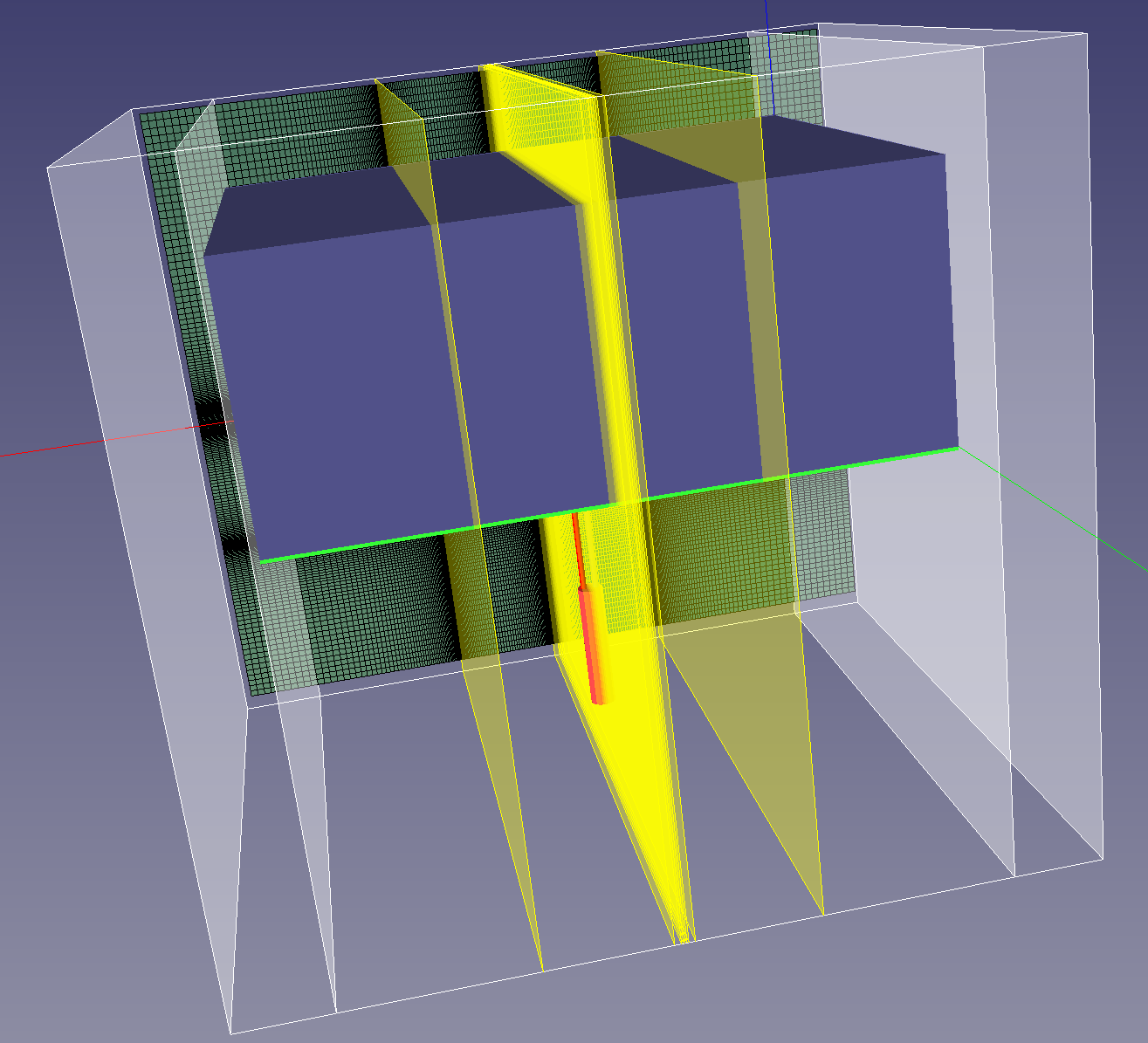 Ability to preview the grid, the marks and the limits of mesh space during mesh generation. The marks (in yellow) are used to define the size of cells between two positions. Between the marks the size of the cells follows a progression according to the algorithm chosen by the user.