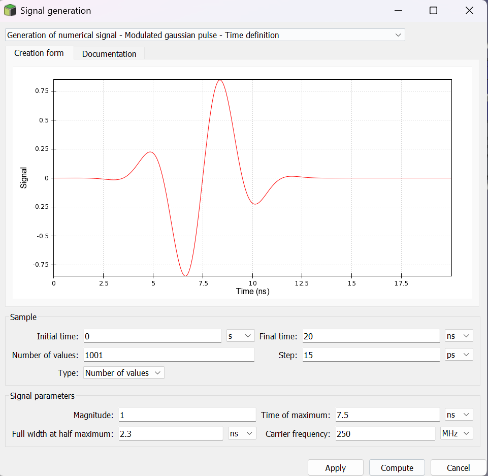 In order to facilitate the implementation of coupling (unidirectional and bidirectional) between MaxSim and Cablesim, the waveform definition windows have been standardized, ensuring consistent excitation configuration. Waveform parameters are retained, allowing configurations to be retrieved after closing the tool, project or simulation.